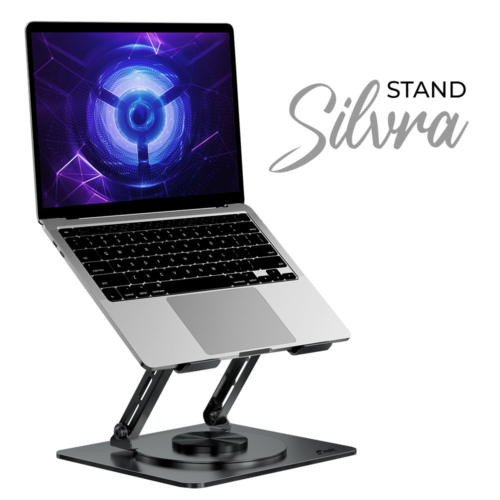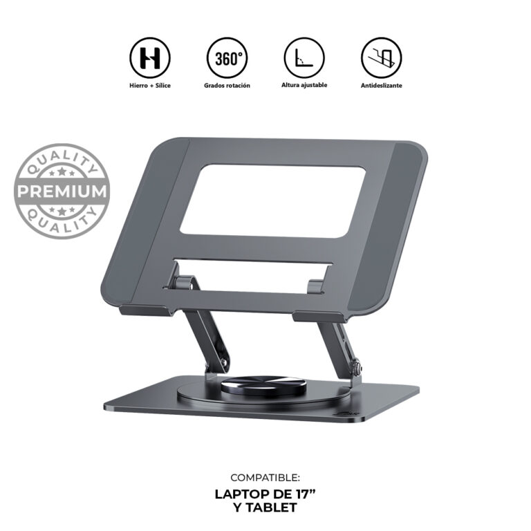 Construcción metálica con base amplia que mantiene la laptop firme y segura durante el uso.