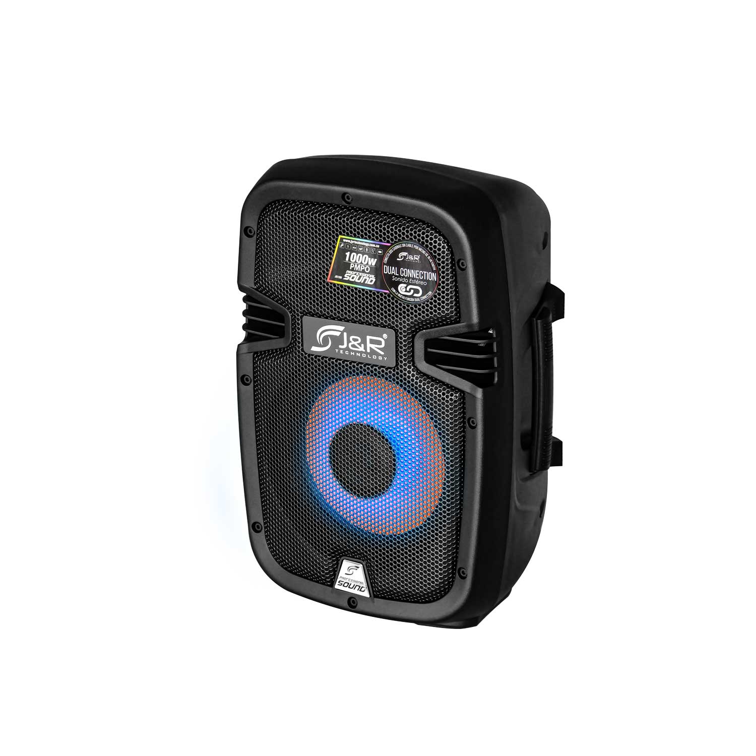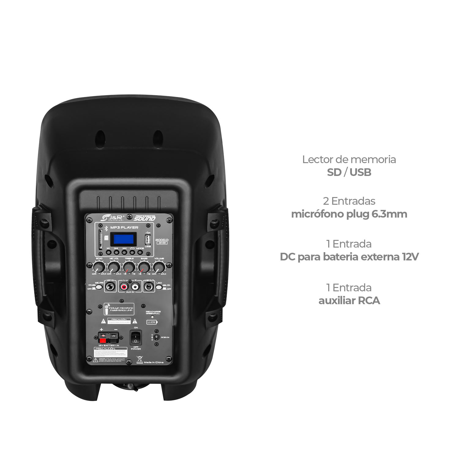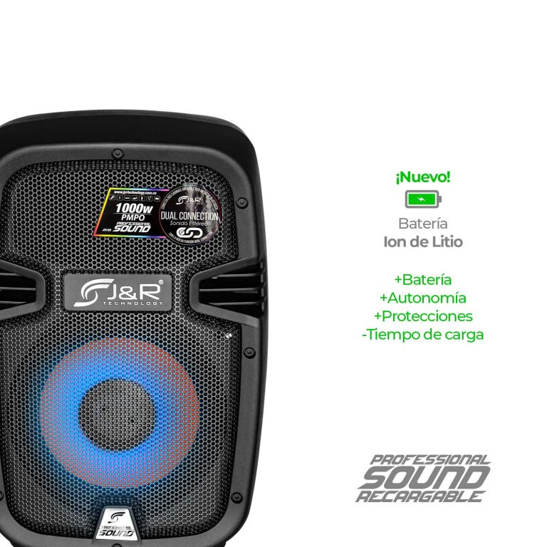 Cabina activa recargable amplificada de dos vías, cuenta con entrada DC para recibir carga de batería externa 12V, incorpora reproductor de formato MP3, WAV, y WMA, lector de memoria SD, USB y sistema Bluetooth, posee una potencia insuperable, entrada y salida auxiliar RCA, iluminación LED frontal, incorpora un control maestro de volumen, control de ecualización para brillo y bajo, entrada plug 6.5mm para micrófono, control de volumen, brillo, bajo y eco del micrófono, incluye un control remoto y un micrófono inalámbrico, 1500W.