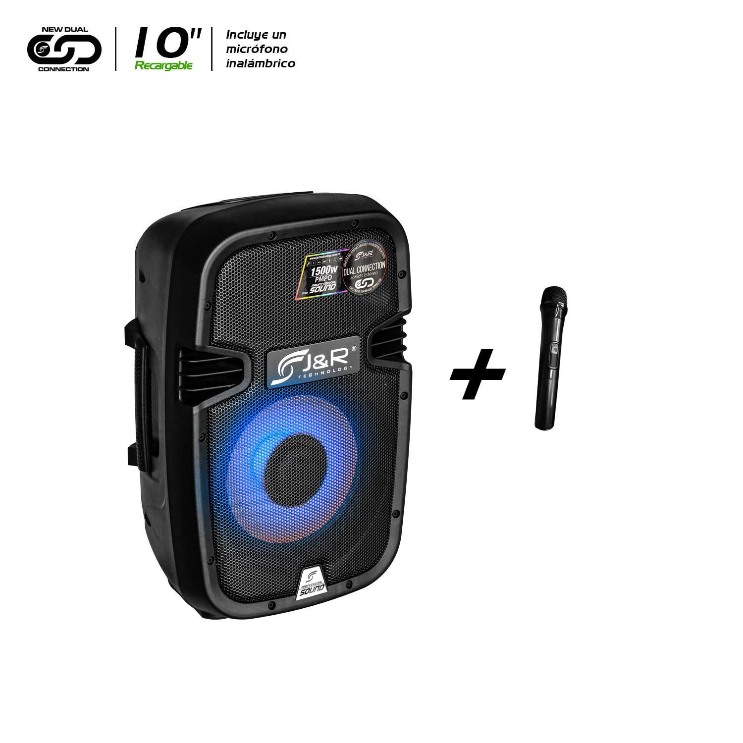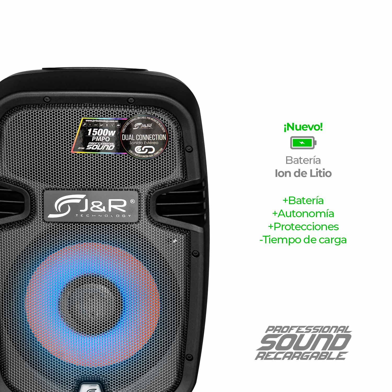 Cabina activa recargable amplificada de dos vías, cuenta con entrada DC para recibir carga de batería externa 12V, incorpora reproductor de formato MP3, WAV, y WMA, lector de memoria SD, USB y sistema Bluetooth, posee una potencia insuperable, entrada y salida auxiliar RCA, iluminación LED frontal, incorpora un control maestro de volumen, control de ecualización para brillo y bajo, entrada plug 6.5mm para micrófono, control de volumen, brillo, bajo y eco del micrófono, incluye un control remoto y un micrófono inalámbrico, 1500W.