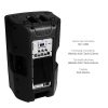 Cabina activa élite amplificada de dos vías, gran potencia de sonido, ideal para ambientar las fiestas, reuniones familiares o promocionar productos, incorpora reproductor de formato MP3, WMA y WAV, lector de memoria SD, USB y sistema Bluetooth, incorpora un control maestro de volumen, control de ecualización para brillo y bajo, línea de entrada XLR hembra (mixer), línea de entrada cannon para micrófono, control de volumen para micrófono, línea de salida pasiva XLR macho, 5000W.