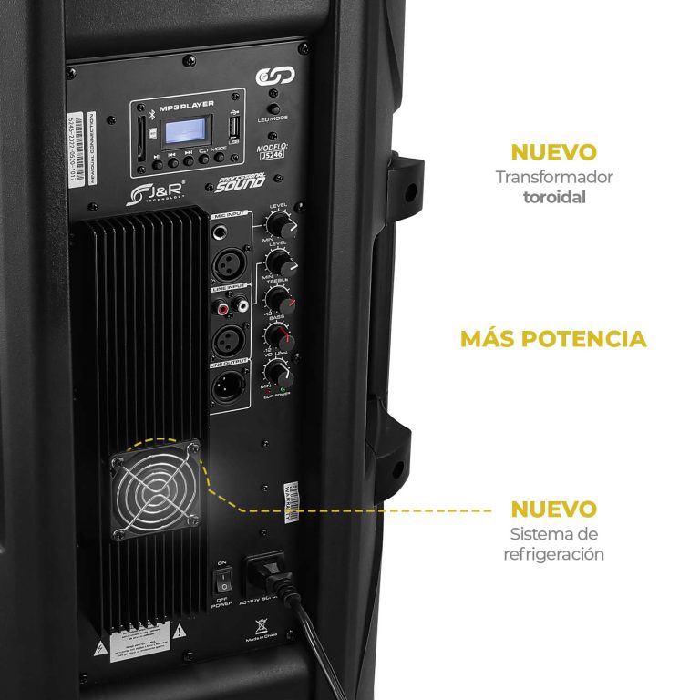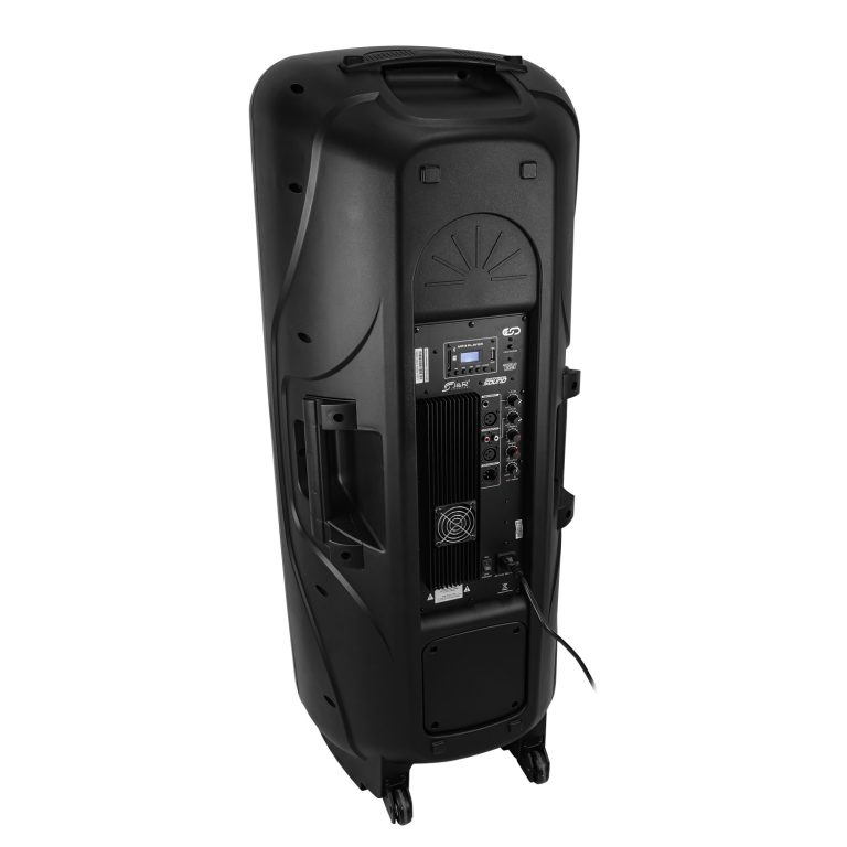 Cabina activa doble amplificada de dos vías, incorpora reproductor de formato MP3, WMA y WAV, lector de memoria SD, USB y sistema Bluetooth, posee una potencia insuperable, entrada de micrófono alámbrico 6.5mm o XLR cannon, línea de entrada auxiliar RCA, línea de entrada XLR hembra (mixer), línea de salida XLR macho (bocina pasiva 8 ohm), iluminación LED frontal, control de volumen y controles independientes para ecualizar brillo y bajo, control de volumen para micrófono y auxiliar, incluye un control remoto.
