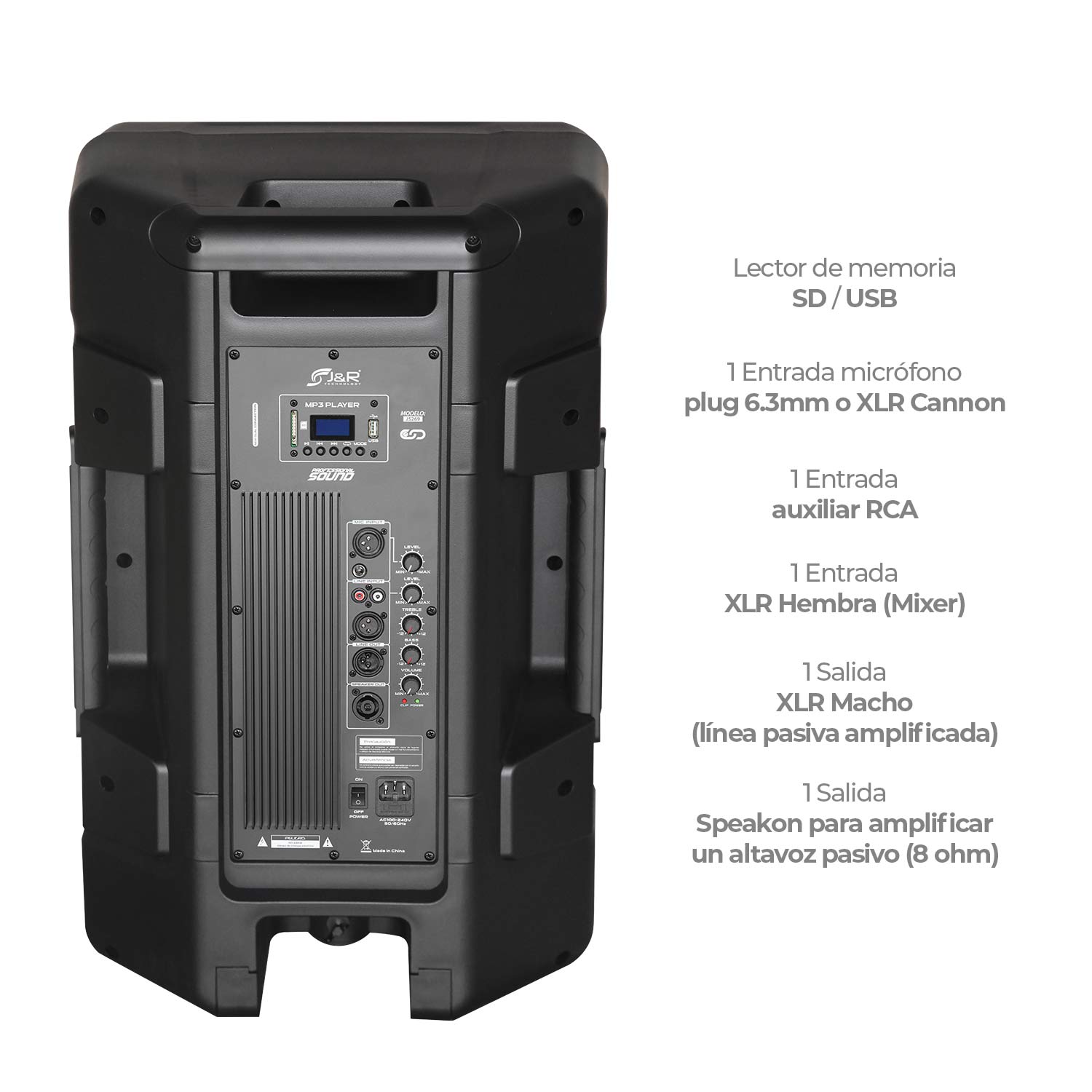 La J&R J5269 es una cabina activa de 15” diseñada para ofrecer un sonido potente y equilibrado, ideal para espacios amplios, DJs, conferencias y uso comercial. Integra múltiples opciones de reproducción, entradas profesionales y controles independientes que te permiten ajustar cada detalle del audio.