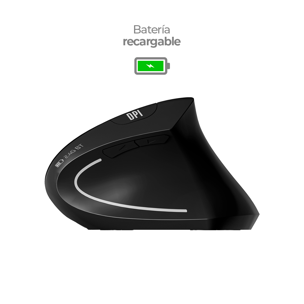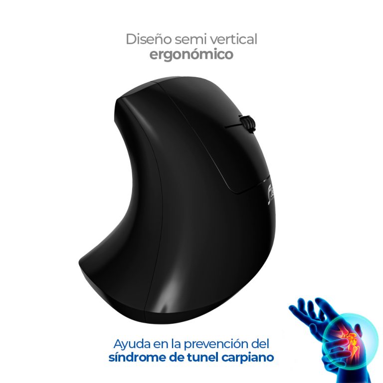 Mouse vertical ergonómico High precision inalámbrico diseñado para la prevención del síndrome del túnel carpiano, cuenta con batería recargable, 6D (6 botones), DPI: graduable 800/1200/1600, frecuencia 2.4 Ghz y Bluetooth funcionamiento hasta 10 metros de distancia